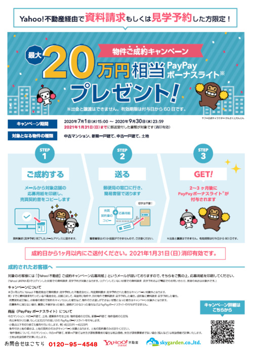 当社は、7/1~9/30まで期間限定企画のYahoo!不動産のポータルサイト PayPayボーナスライトキャンペーンの登録業者です!